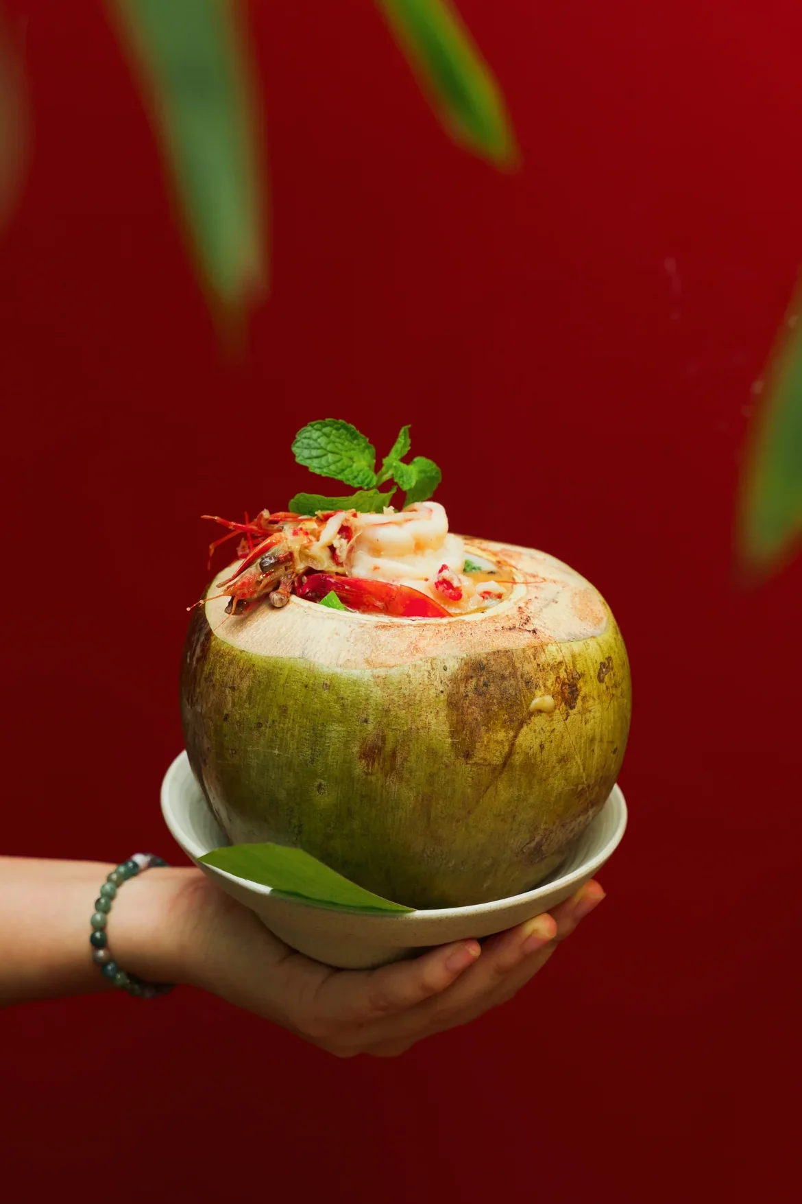 Thực khách có thể bắt đầu bữa ăn bằng món Nem Hà Nội giòn rụm hoặc Chả cá ngần thơm bùi. Nếu yêu thích hương vị món ăn miền Nam, Tôm hầm trong quả dừa với vị ngọt thanh tao của nước dừa thấm đẫm vào từng thớ thịt tôm chắc nịch cùng rau củ tươi rói là sự lựa chọn tuyệt vời. Với những ai yêu thích hương vị núi rừng Tây Bắc, món Thịt lợn nướng lá mắc mật với mùi thơm nồng nàn đặc trưng hay Cá tầm nướng vàng óng, thịt cá béo ngậy chắc chắn sẽ làm thỏa mãn cả những vị khách khó tính nhất. Hành trình trải nghiệm vị giác ấy sẽ càng thêm trọn vẹn với Bánh chuối bà Gigi – món tráng miệng ngọt ngào mang kỷ niệm tuổi thơ của Chef-Founder Vincent Cao Minh Page. Thực khách yêu thích sự sáng tạo có thể thưởng thức Creme Bruklee lá dứa ngọt thơm hấp dẫn.