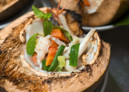 Cá vược nướng lá chuối là món ăn thể hiện rõ sự tinh tế trong cách xây dựng cấu trúc hương vị của Chào Bạn. Bên trên lớp cá là mộc nhĩ và cà rốt thái nhỏ, thấm xốt chanh leo chua dịu, đi kèm những miếng xoài nhỏ và cà chua thái lát tạo điểm nhấn tươi mát. Đậu phụ được thêm vào như một yếu tố trung hoà, giúp cân bằng vị chua và mang lại cảm giác mềm mại cho tổng thể món ăn.