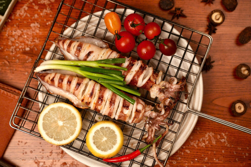 Mực nướng và rau củ theo mùa là lựa chọn cân bằng giữa hải sản và rau xanh, phù hợp cho những bữa ăn nhẹ nhàng nhưng vẫn tròn vị. Mực được chọn loại tươi, nướng vừa tới để giữ độ giòn và vị ngọt tự nhiên. Đi kèm là các loại rau củ theo mùa, được nướng cùng thời điểm để giữ màu sắc, độ giòn và hương vị nguyên bản.